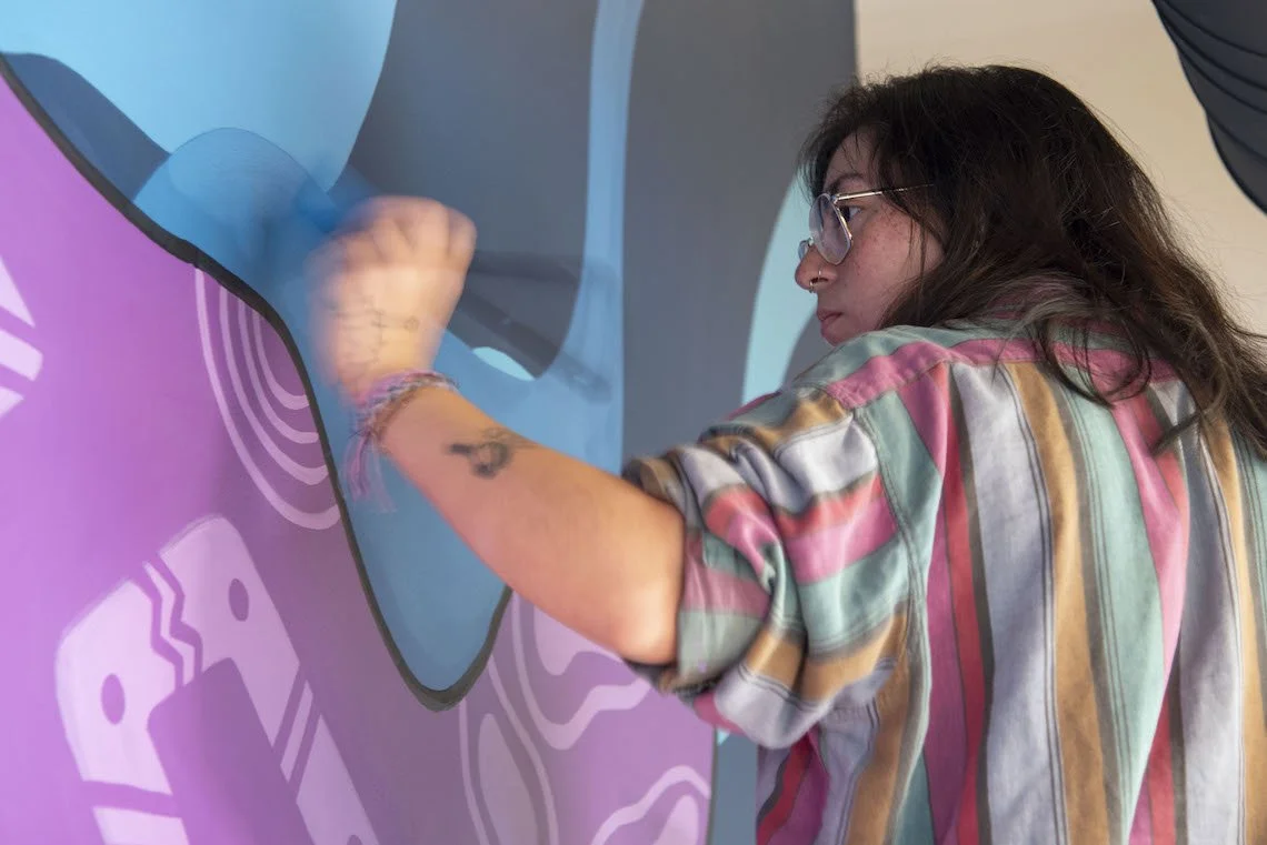 I applied and won a call for art to paint a mural at the new McGoldrick Center that was opening up on USM’s Portland campus end of summer 2023! This was a really awesome full circle moment for me being a USM alumna and where I had been involved with the Native American Student Alliance (now known as Student Alliance of Indigenous Peoples) during my time at the university.
